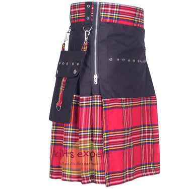 The Black & Royal Stewart Modern Kilt for Men combines contemporary style with traditional Scottish design. Featuring a unique half-black and half-Royal Stewart tartan, this kilt includes practical pockets, sewn-down pleats, and a secure snap and zip closure. Made to measure, it ensures the perfect fit for any occasion.