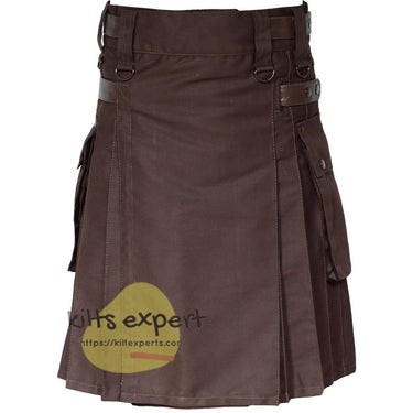 Chocolate Brown Leather Straps Utility Kilt With Brown Rivets and Brown Straps