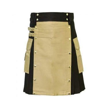 The Khaki Modern Utility Kilt for Active Men is a versatile and stylish garment, available in khaki and black colors. Made from pure cotton fabric, this kilt is designed for comfort and durability. It features two spacious pockets, golden studs, and secure buckles for fastening. The sewn-down pleats ensure a sharp and polished look, making it perfect for casual wear, work, or traditional events.