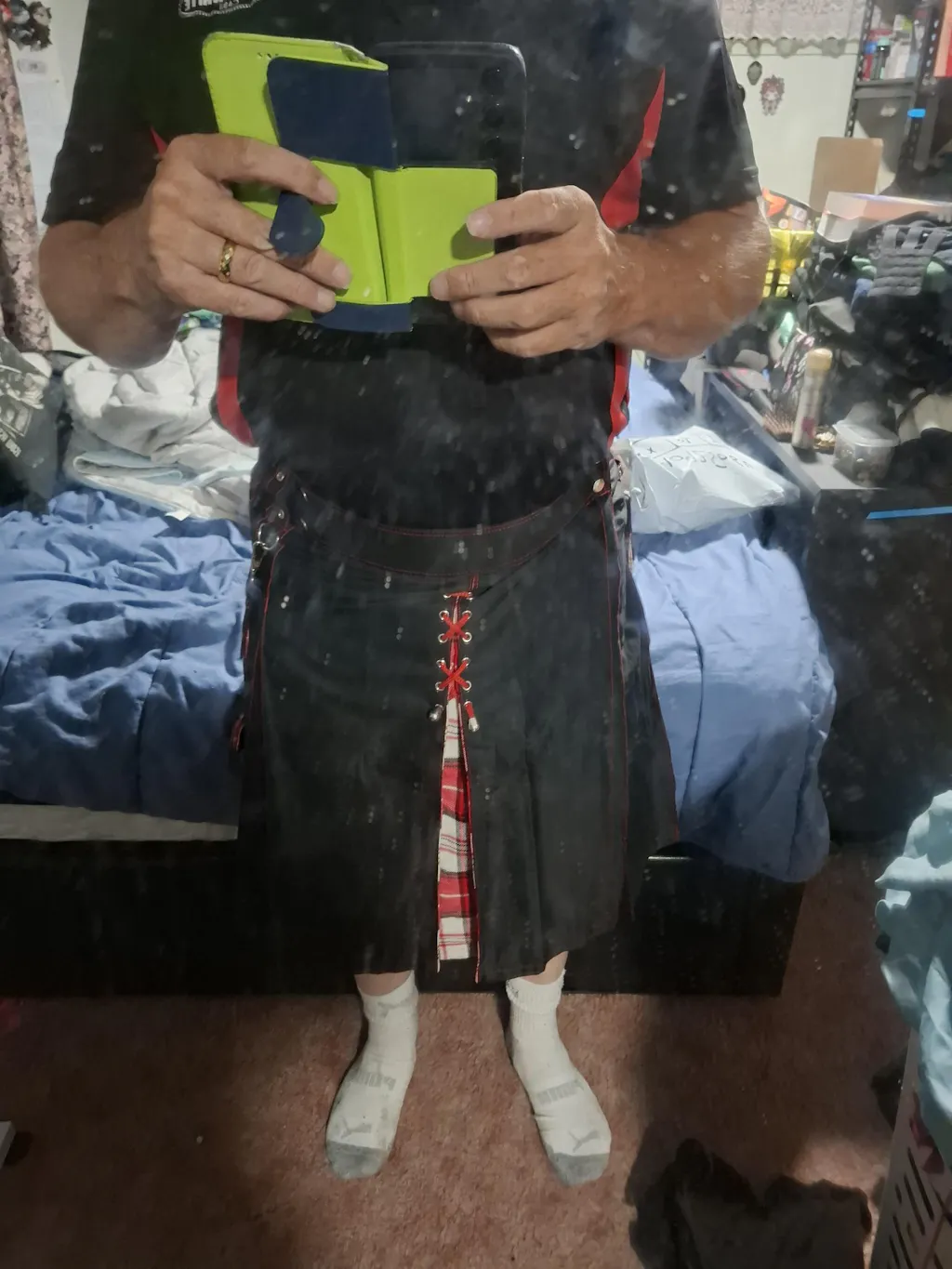 Kilt size is different from pant size. For the most accurate fit, measure at the belly button (waist), hips, and the length from the belly button to the middle of the knee.